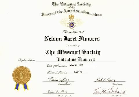 Nelson Received SAR membership as a descendant of Valentine Flowers